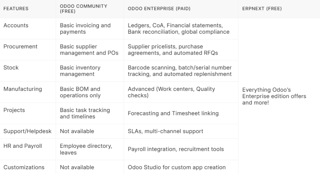 Odoo divides features between its Community (free) and Enterprise (paid) editions, with many advanced capabilities locked behind their hefty paid version.